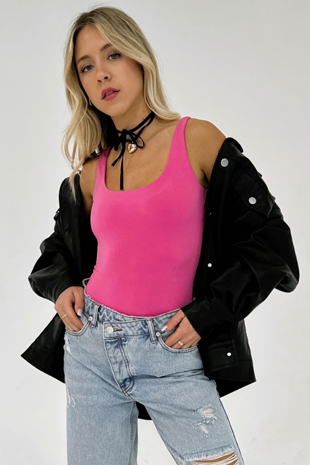 Look no further than the Aura Tank Bodysuit for your must-have look! This double-lined wonder is super soft and ready for you to mix and match with any of your favorite pieces. Get one in every color and you'll never be without the perfect bodysuit! #wardrobegoals