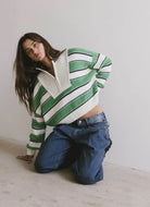 Get ready for some cozy with a touch of prep! Stay stylish in our Baxter sweater, with its bold stripes in a fun Kelly green, navy, and white combo. Made from a chunky blend, it boasts a rib-knit mock neck, relaxed dropped-shoulder sleeves, and a cropped boxy fit that will keep you on-trend with ease.